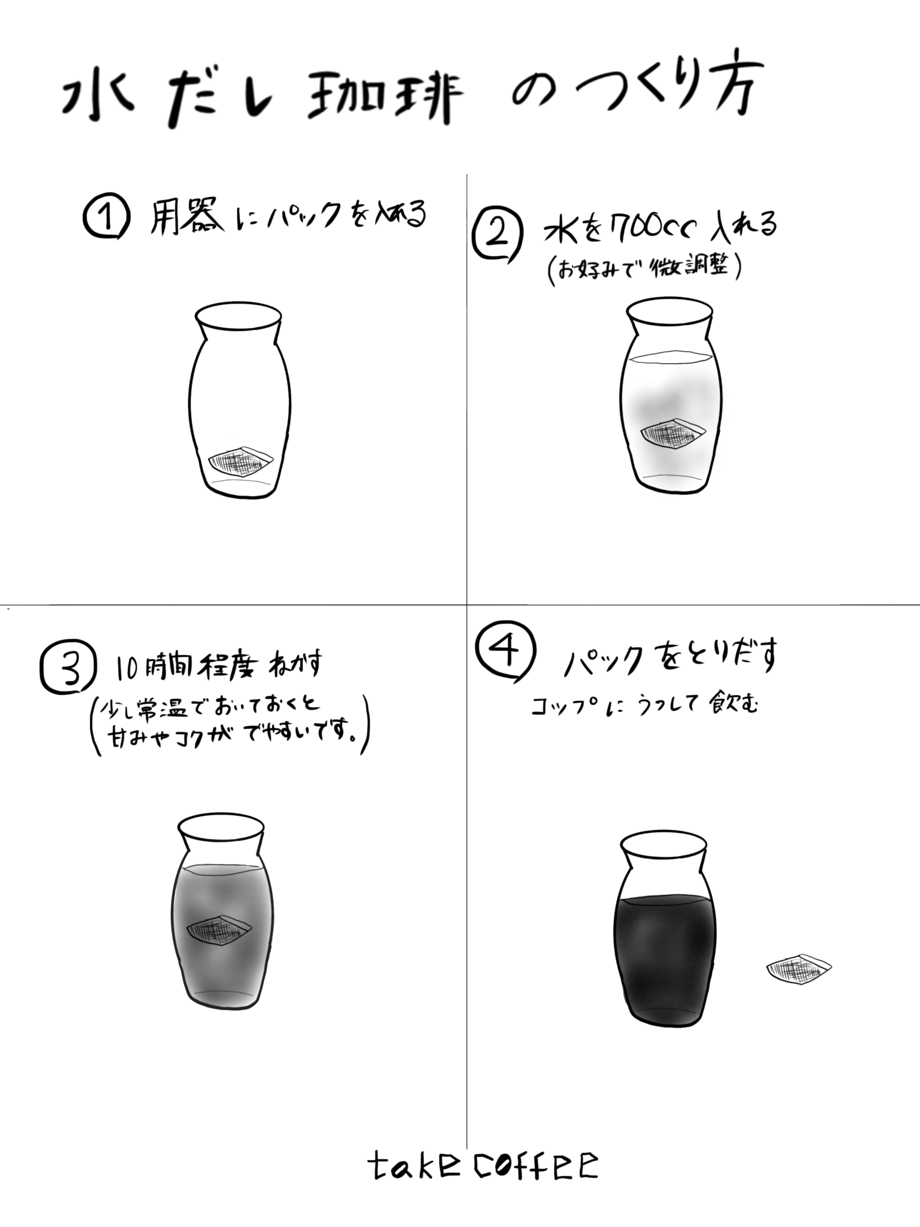 ①800cc〜1L程度のポットを用意。水出しパックを入れる
